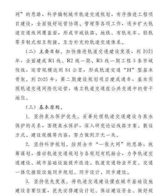 《實施意見》中提出,濟南軌道交通建設額的主要目標是:加快推進軌道交通建設發展,到2021年,全面建成R1線、R2線一期、R3線一期工程3條市域快線,運營規模達到84公里,形成軌道交通“H”型基本骨架。到2025年,第二期建設規劃項目建成通車,基本實現軌道交通網絡化運營,建立軌道交通在公共交通中的骨干地位。