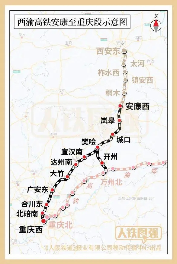 西渝高鐵安康至重慶段自安康西站起,經陜西省安康市,重慶市城口縣,四川省達州市、廣安市,重慶市合川區、北碚區,引入重慶樞紐重慶西站,共設安康西、嵐皋、城口、樊噲、宣漢南、達州南、大竹、廣安東、合川東、北碚南、重慶西11座車站,其中重慶西為既有車站,其他為新建車站;西渝高鐵與鄭渝高鐵連接線自西渝高鐵安康至重慶段樊噲站起,途經四川省達州市,重慶市開州區、萬州區,終至鄭渝高鐵萬州北站,新建開州站1座車站。