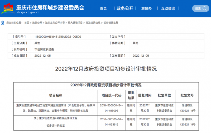 重慶軌道交通18號線工程富華路至跳蹬南段(不含歇臺子站、楊家坪站、跳蹬站、跳蹬南站、金鰲寺車輛段)及重慶軌道交通4號線西延伸段工程兩個工程項目的初步設計已經于近日獲批。