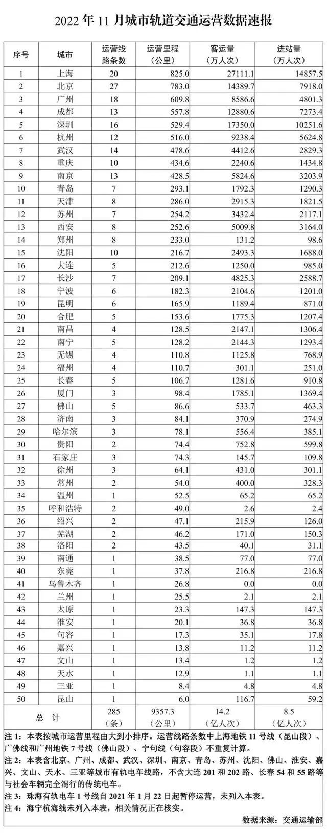 以下為交通運輸部公布的2022年11月城市軌道交通運營數據速報: