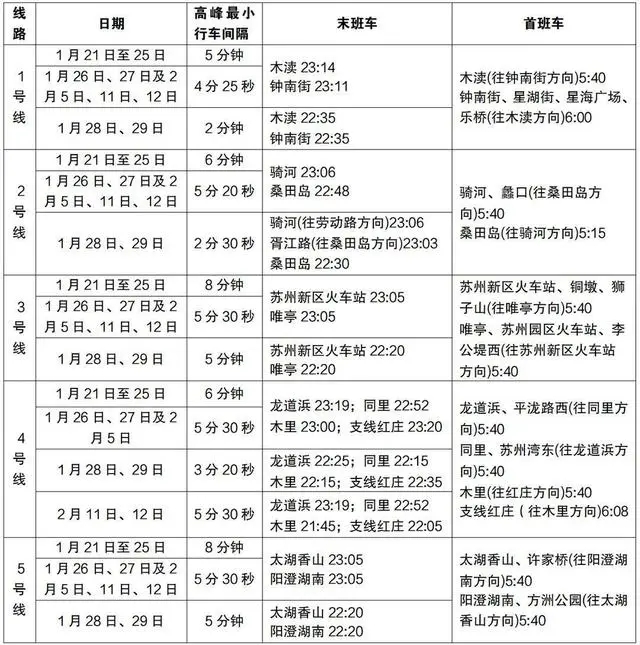 延長線網運營服務時間,春節假期(1月21日至27日)、元宵節(2月5日)及春運最后一個周末(2月11日、12日)期間,1、2號線及4號線主線運營服務時間與常規周末一致,3、5號線雙向延長45分鐘,4號線支線雙向延長45分鐘(2月11日、12日除外)。