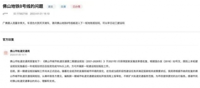日前,有網(wǎng)友在人民網(wǎng)領(lǐng)導(dǎo)留言板提問:請問佛山地鐵8號線能進(jìn)入下一輪地鐵規(guī)劃嗎,可以早日動工建設(shè)嗎?