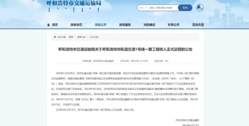 2019年12月29日,呼和浩特市城市軌道交通 1 號線一期工程開通初期運營,根據《城市軌道交通正式運營前和運營期間安全評估管理暫行辦法》(交運規〔2019〕16號)規定,呼和浩特市交通運輸局組織第三方評估機構于2022年9月14日至16日對呼和浩特市城市軌道交通1號線一期工程進行了正式運營前安全評估并順利通過。經呼和浩特市交通運輸局申請和市政府批復,呼和浩特市軌道交通1號線一期工程于2023年2月13日轉入正式運營。