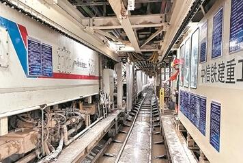 5月9日,在地鐵1號線史家灣站站臺東側,南北兩個隧洞口傳出一陣陣轟轟的機器聲。其中,北側的隧洞口不時有裝滿渣土、管片的“電動小火車”進出;南側隧洞口的盾構機,前端已深入洞中,正全力以赴向前推進。