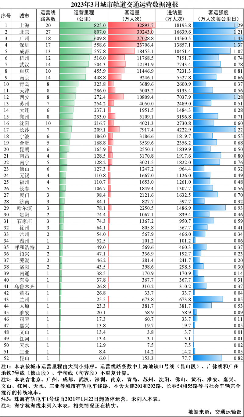 2023年3月,31個(gè)省(自治區(qū)、直轄市)和新疆生產(chǎn)建設(shè)兵團(tuán)共有54個(gè)城市開(kāi)通運(yùn)營(yíng)城市軌道交通線路292條,運(yùn)營(yíng)里程9652.6公里,實(shí)際開(kāi)行列車316萬(wàn)列次,完成客運(yùn)量25.4億人次,進(jìn)站量15.3億人次。3月份,客運(yùn)量環(huán)比增加3.6億人次、增長(zhǎng)16.6%,同比增加9.4億人次、增長(zhǎng)58.9%,較2019年月均客運(yùn)量增加5.5億人次、增長(zhǎng)27.9%。3月份客運(yùn)強(qiáng)度平均水平為0.526萬(wàn)人次每公里日,較2019年全年客運(yùn)強(qiáng)度平均水平降低3.6%。