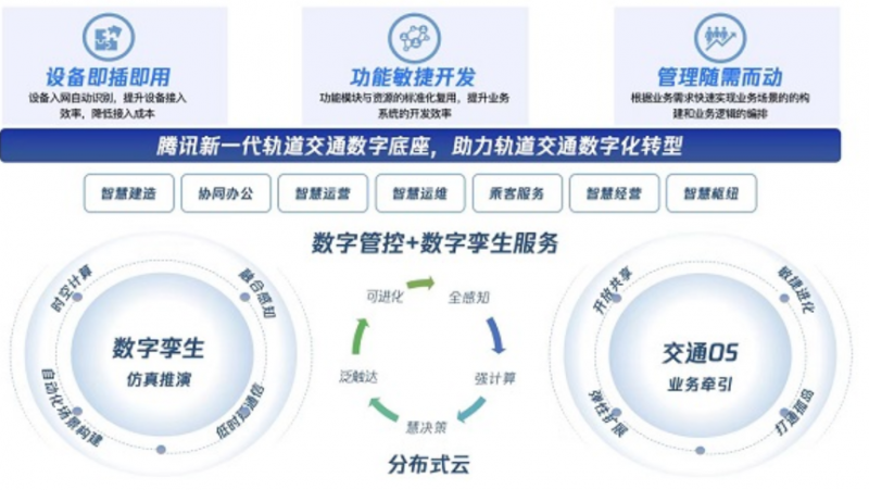 騰訊服務軌道交通建設背后的技術支撐,展開來講,主要在于以數字化、網絡化和智能化為牽引,以數據為關鍵要素和核心驅動,依托在云計算、大數據、AI等核心技術領域的深厚沉淀,構建了一整套完善的數字底座能力體系,打造了“實時孿生+交通OS”雙輪驅動的數字底座。