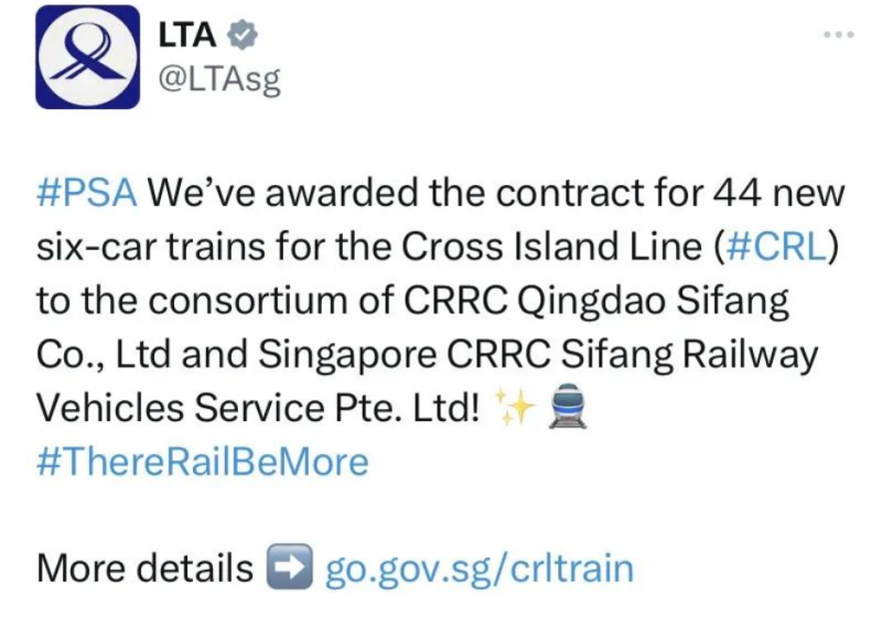 6月14日,新加坡陸路交通管理局(LTA)已將為跨島線(CRL)提供44列6編組新車的合同授予中車四方。合同價值5.89億新元(4.39億美元),包括11列增購以及提供長期服務支持選項。新車將完全交由中車四方設計制作,預計將于2027年開始逐步交付。