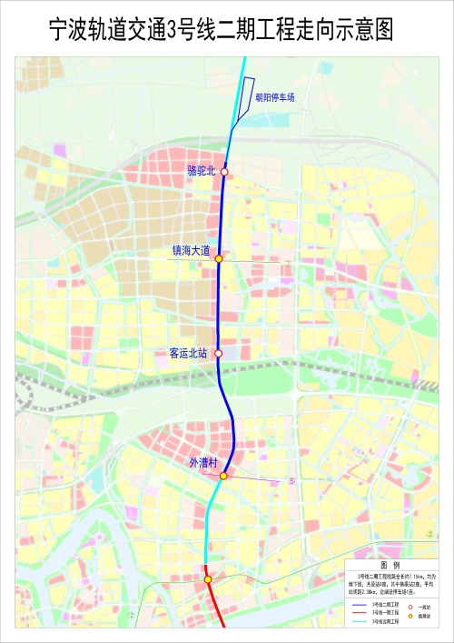 寧波市軌道交通3號(hào)線二期工程位于江北區(qū)和鎮(zhèn)海區(qū)。線路起點(diǎn)設(shè)于外漕村站,向北沿規(guī)劃錦堂路敷設(shè),下穿北環(huán)快速路和鐵路后,進(jìn)入鎮(zhèn)海新城沿慈海南路向北行進(jìn),分別在永茂西路、鎮(zhèn)海大道路口設(shè)置客運(yùn)北站和鎮(zhèn)海大道站,終點(diǎn)站駱駝北站設(shè)置于鎮(zhèn)駱路路口。