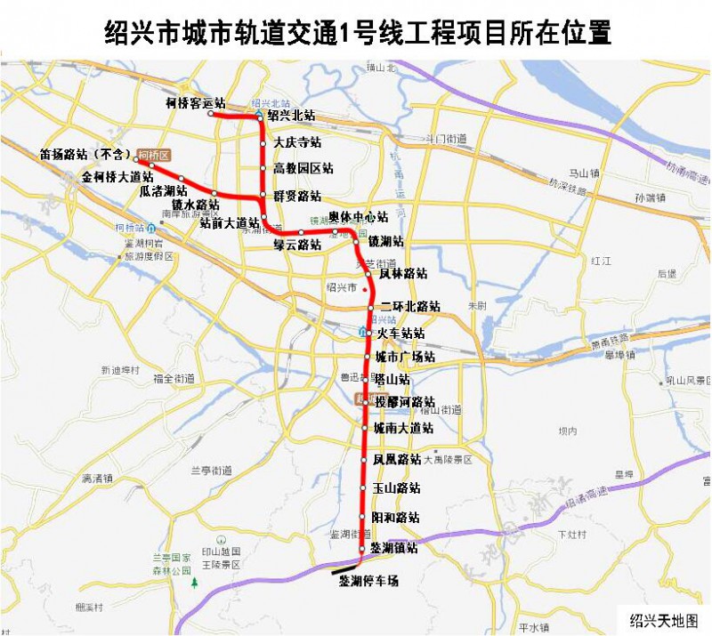 根據紹興市城市軌道交通1號線工程可行性研究成果,主線工程自笛揚路站(不含)至鑒湖鎮站,長度為24.2公里,設18座車站;支線工程自站前大道至柯橋客運站,長7.1公里,設站6座。全線工程總占地面積28.8公頃,約432畝,總選址面積220.2公頃,約3301畝。建設標準為城市軌道交通,雙線,設計最高時速100公里,采用B型車6輛編組,預計2021年完工。