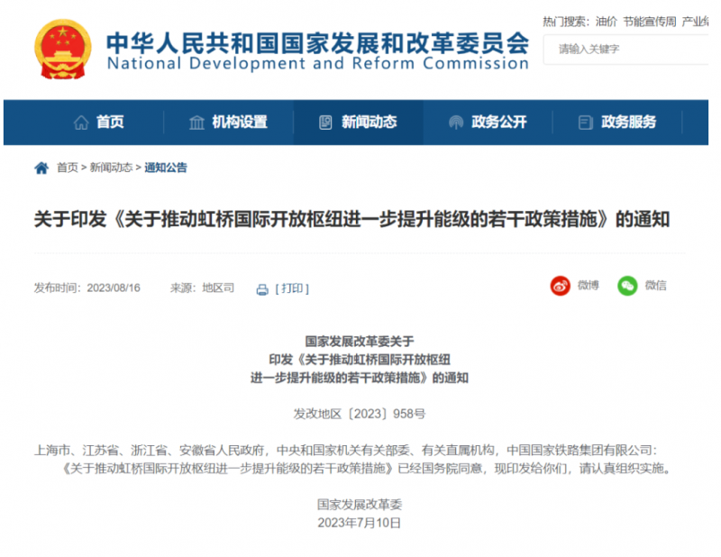 據國家發改委網站,國家發改委印發《關于推動虹橋國際開放樞紐進一步提升能級的若干政策措施》。其中提出,打造虹橋綜合交通樞紐功能拓展區。支持合肥高質量開行中歐班列,強化與沿海港口城市協同聯動,發展海鐵聯運新通道。