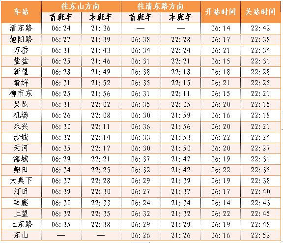 每周五,清東路開往東山方向末班車發車時間從21:36延長至22:31;東山開往清東路方向末班車發車時間從21:26延長至22:24。各站末班車發車時間同步調整,具體如下:
