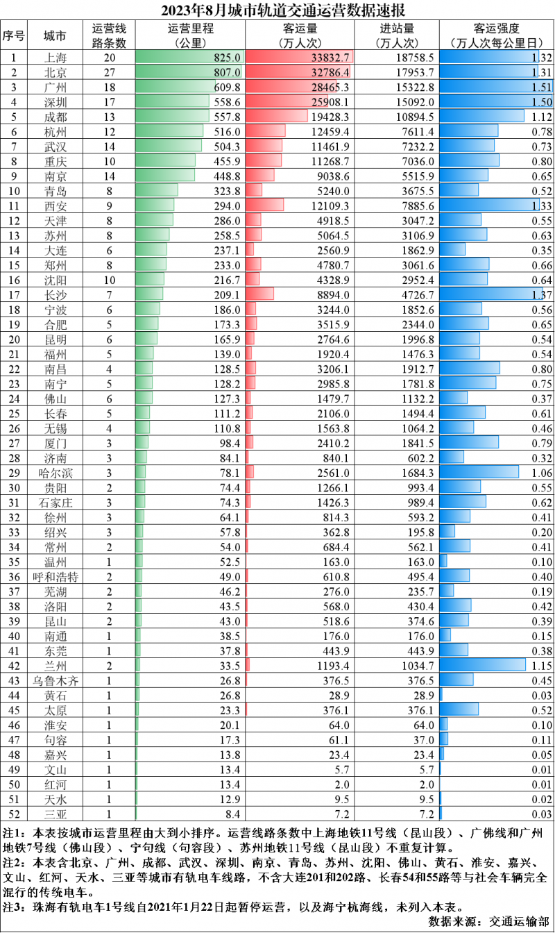 2023年8月,31個(gè)省(自治區(qū)、直轄市)和新疆生產(chǎn)建設(shè)兵團(tuán)共有54個(gè)城市開通運(yùn)營(yíng)城市軌道交通線路297條,運(yùn)營(yíng)里程9771.8公里,實(shí)際開行列車325萬(wàn)列次,完成客運(yùn)量27.1億人次,進(jìn)站量16.3億人次。8月份,客運(yùn)量環(huán)比增加0.4億人次、增長(zhǎng)1.7%,同比增加7.5億人次、增長(zhǎng)38.4%,較2019年月均客運(yùn)量增加7.2億人次、增長(zhǎng)36.0%。8月份客運(yùn)強(qiáng)度平均水平為0.556萬(wàn)人次每公里日,較2019年全年客運(yùn)強(qiáng)度平均水平增長(zhǎng)1.9%。
