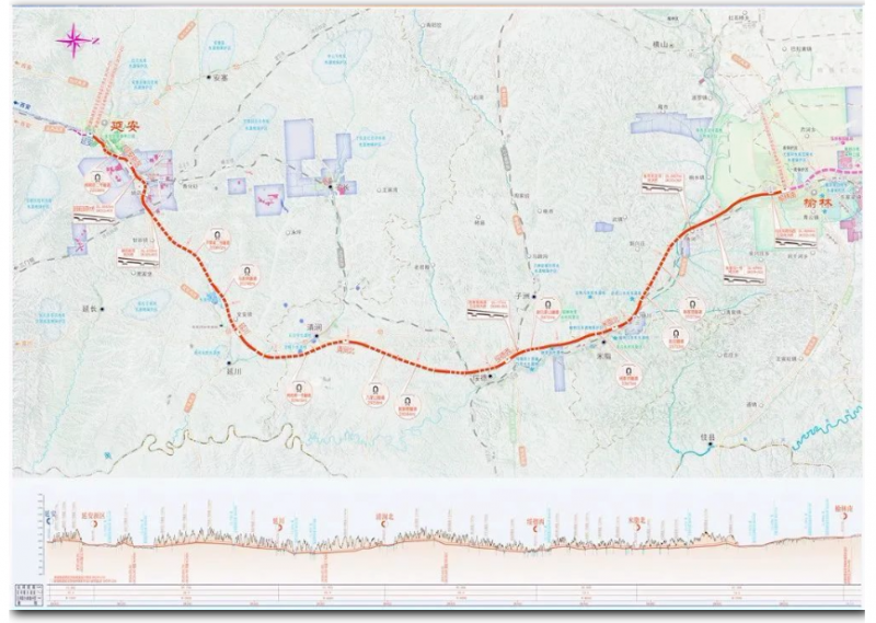 延榆高鐵自延安站引出向北經(jīng)延安市寶塔區(qū)、延川縣榆林市清澗縣、綏德縣、米脂縣橫山區(qū)至榆林南站。