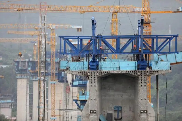 該區間是全線唯一的高架區間,高架橋全長2705米,主梁最大跨徑130米,平均墩高70米,相當于20多層樓高,其中超過90米的墩柱就有4座,也是全線重點控制性工程。