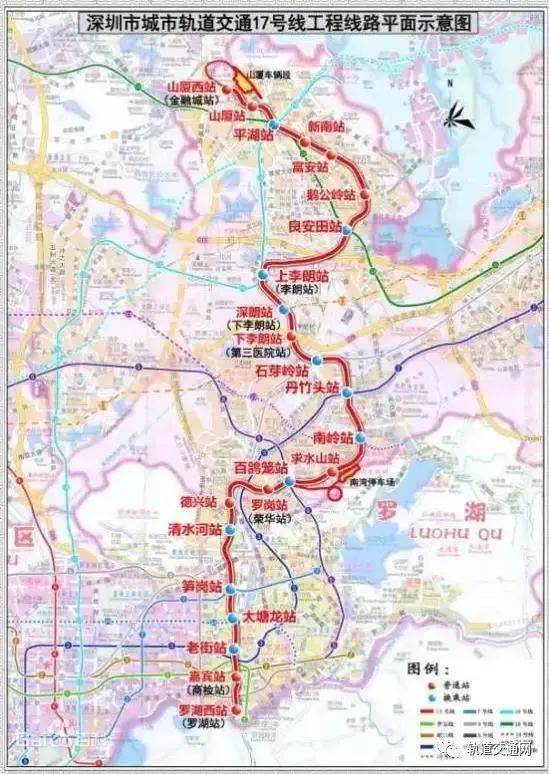 深圳地鐵17號線(平湖線)是聯系深圳市羅湖中心區與龍崗布吉街道、南灣街道、平湖街道片區的軌道線路,線路全長約28.7公里,共設25座車站。其中一期工程起于羅湖西站,止于上李朗站;該線路全長18.8公里,設18座車站,將支持羅湖口岸經濟帶、筍崗清水河等片區發展。