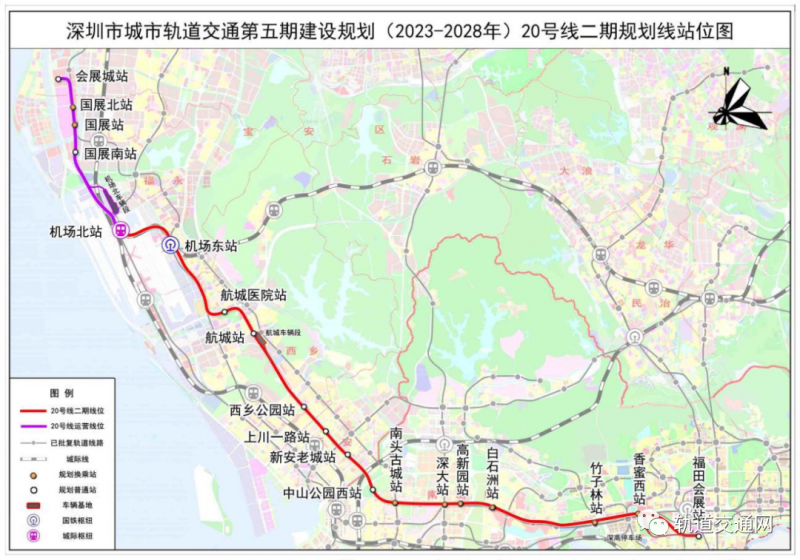深圳地鐵20號線二期工程線路起自南山區白石洲站,途經南山科技園、寶安西鄉,終至既有20號線一期機場北站(不含)。二期線路全長約24.9km,設站11座,其中換乘站9座,平均站間距2.24km,采用全地下敷設方式;設計最高運行速度120km/h,采用A型車6A/8A編組混跑,DC1500V接觸網供電;本期新建航城車輛段1座,不新建主變,共享利用機場北主變電所和靈芝公園主變電所,控制中心共享利用深云NOCC。
