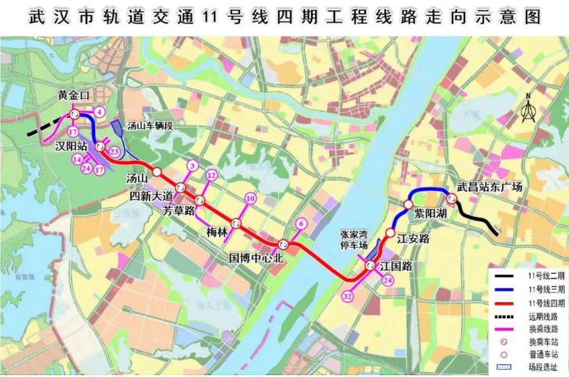 四期段起于漢陽站(不含),主要沿四新大道、規劃道路,新武金堤路敷設,連接漢陽火車站、四新城市副中心及武昌白沙洲片區,止于11號線三期工程起點江安路站(不含),是支撐城市東西向發展的重要軸線。