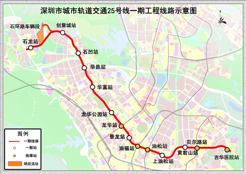 深圳市城市軌道交通25號線一期工程起自石龍站,終至吉華醫院站。線路先后沿德政路、石龍仔路、大浪北路、華盛路、龍華人民路、工業路、貝爾路、吉華路敷設,途經寶安石巖片區、龍華大浪片區、龍華中心片區及龍崗坂田片區。一期工程線路全長約16.5km,設車站14座,其中換乘站5座,平均站間距約1.2km;采用全地下敷設方式,系統規模為A型車6輛編組,列車設計速度為80km/h。一期工程建設車輛段1處,為石環路車輛段,位于德政路以北、石巖外環路以東地塊內;新建主所1座,位于石環路車輛段內;共享既有主所1座,為既有10號線雪象北主所;牽引供電系統采用DC1500V架空接觸網供電、專用軌回流方式,控制中心設于全網NOCC。