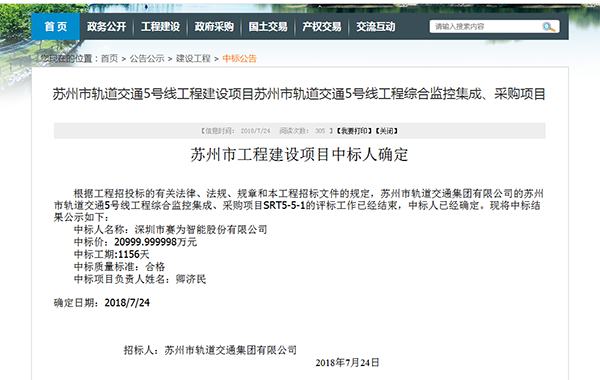 近日,蘇州公共資源交易中心發(fā)布蘇州市軌道交通5號線工程綜合監(jiān)控集成、采購項目中標(biāo)公告,確認深圳市賽為智能股份有限公司為該項目的中標(biāo)人,中標(biāo)金額為20999.999998萬元。