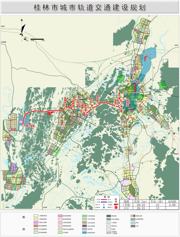 桂林市城市軌道交通1號線一期工程具體方案:1號線一期工程西起桂林兩江機場,設兩江機場地下站,向北地下敷設約1.9km后,轉(zhuǎn)至地面高架敷設,后沿機場高速南側(cè)高架敷設至臨桂新區(qū)會展中心,設會展中心站后沿公園北路路中設一院兩館、山水公園站、仕通路、新龍路站轉(zhuǎn)至人民路敷設,線路沿人民路-金水路路中設金山廣場站、金水路口、站后沿翠竹路路側(cè)高架敷設,下穿衡柳鐵路高架橋后,繼續(xù)沿翠竹路路側(cè)轉(zhuǎn)至鐵路北側(cè)敷設,設官橋站后沿黑山路設黑山路站后向北敷設至翠竹路,設翠竹路站后沿翠竹路向東敷設至線路終點桂林站。