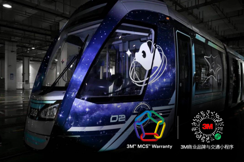 在主題列車的整體設(shè)計上,3M貼膜通過精確、快捷的數(shù)碼打印技術(shù)將“銀藍色”這一主色調(diào)展現(xiàn)的淋漓盡致,同時在車身裝飾膜上打印了機甲元素,在玻璃貼中融入了星云造型及本次大會的吉祥物熊貓“科夢”。無論是醒目的銀藍配色,還是繽紛的科幻插圖,3M車身貼膜憑借豐富效果與高清畫面,深度還原了“未來列車”該有的樣子。此外,3M貼膜支持靈活設(shè)計和快速施工的優(yōu)勢,能夠隨時隨地供應定制材料,縮短工期,充分滿足成都列車早期的個性化設(shè)計需求,并在大會前夕順利完成整體施工。