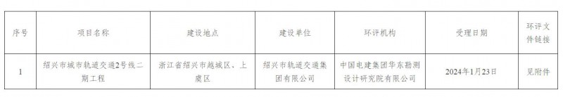 紹興市生態環境局關于受理紹興市軌道交通集團有限公司紹興市城市軌道交通2號線二期工程環評文件的公示