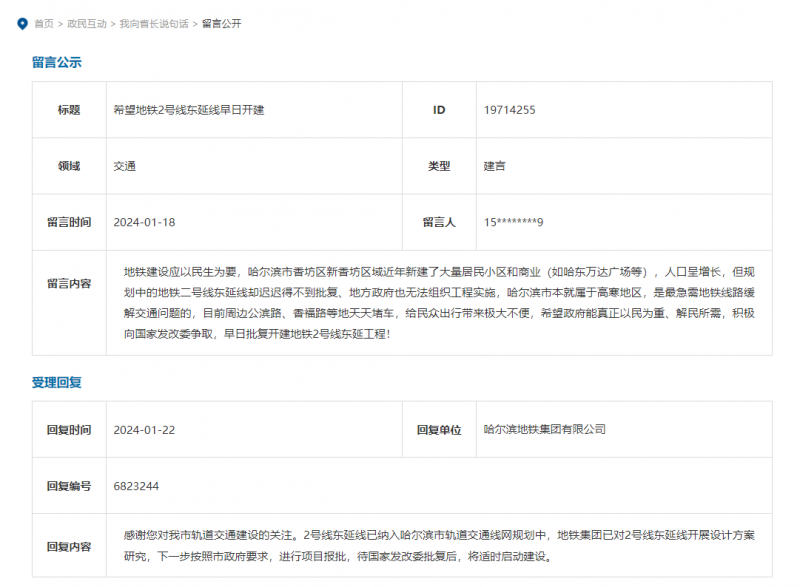 1月18日,有網(wǎng)友公開留言希望哈爾濱地鐵2號線東延線早日開建,官方回復(fù),2號線東延線已納入哈爾濱市軌道交通線網(wǎng)規(guī)劃中,地鐵集團已對2號線東延線開展設(shè)計方案研究,下一步按照市政府要求,進行項目報批,待國家發(fā)改委批復(fù)后,將適時啟動建設(shè)。