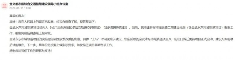 另外,近日有網友咨詢金武永東軌道交通相關規劃問題,金義都市區綜合交通樞紐建設領導小組辦公室1月10日答復是這樣的:金武永東市域軌道項目已列入《長江三角洲地區多層次軌道交通規劃》(系遠期布局項目)。當前,我市正開展市域鐵路二期建設規劃(含金武永東市域軌道項目)編制工作,編制完成后將逐級上報審批。