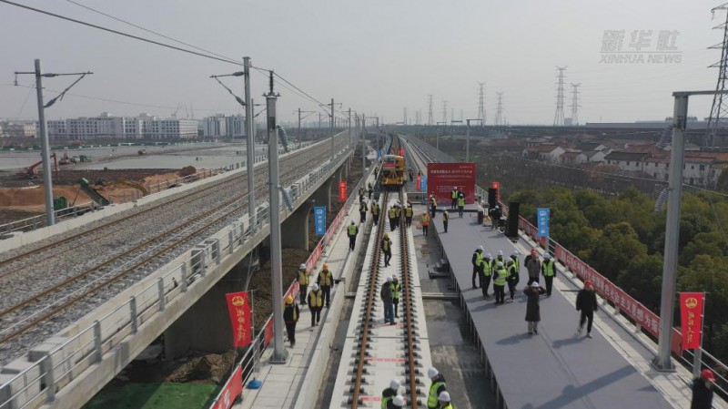 2024年3月2日,在上海市松江區(qū)滬蘇湖鐵路施工現(xiàn)場(chǎng),首對(duì)500米長(zhǎng)鋼軌被鋪軌機(jī)鋪設(shè)到無(wú)砟軌道床上,標(biāo)志著滬蘇湖鐵路開始全線鋪軌。