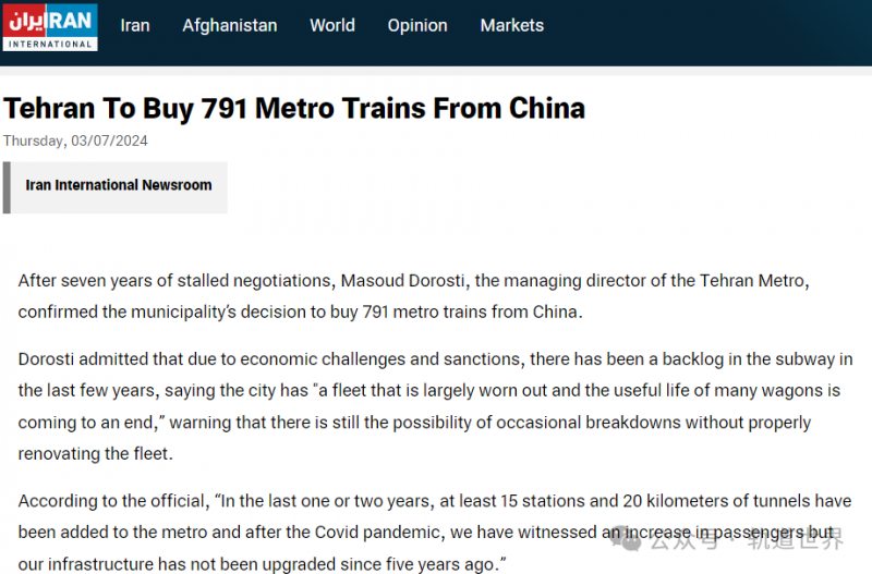 據Iranintl報道,經過7年的漫長談判,伊朗德黑蘭地鐵管理負責人Masoud Dorosti證實,由于列車服務年限過久,德黑蘭地鐵將從中國購買791節新車。