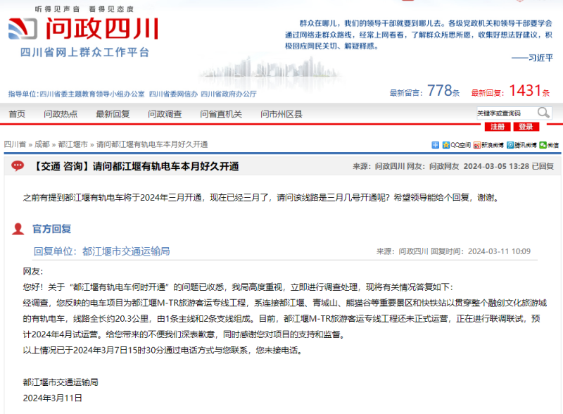 近日有網友在問政四川平臺上咨詢都江堰有軌電車具體于何時開通。