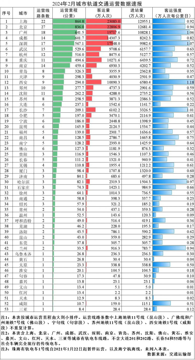其中,地鐵、輕軌、市域快速軌道等大運(yùn)量線路共267條,運(yùn)營(yíng)里程9499.8公里,完成客運(yùn)量20.1億人次,進(jìn)站量12.1億人次;單軌、磁浮等中運(yùn)量線路共7條,運(yùn)營(yíng)里程202.5公里,完成客運(yùn)量3175萬(wàn)人次,進(jìn)站量2304萬(wàn)人次;有軌電車(chē)、自動(dòng)導(dǎo)向軌道等低運(yùn)量線路共34條,運(yùn)營(yíng)里程503.3公里,完成客運(yùn)量888萬(wàn)人次,進(jìn)站量851萬(wàn)人次。