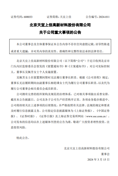 天宜上佳3月14日晚公告,公司于近日收到北京市門頭溝區監察委員會簽發的《留置通知書》和《立案通知書》,對公司實際控制人、董事長吳佩芳個人實施留置。