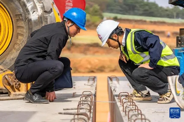 3月22日,監理人員在落梁過程中檢查梁縫寬度是否符合設計要求。新華社記者 胡超 攝