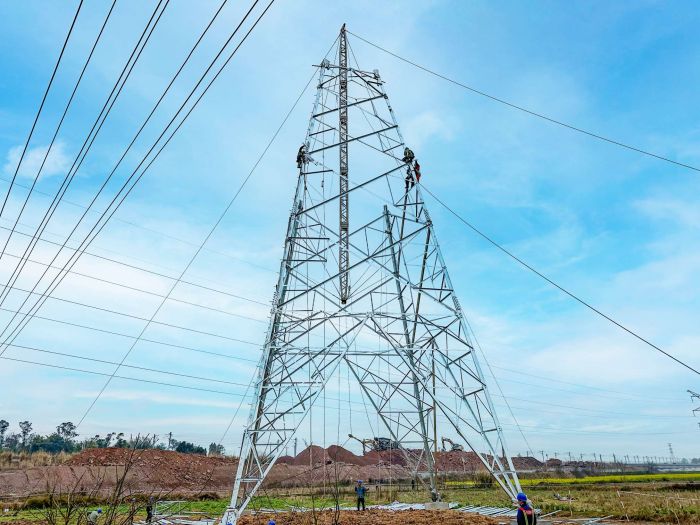 圖為國網南充供電公司電力員工正在為漢巴南鐵路(順慶段)電力設施遷改工程組立鐵塔