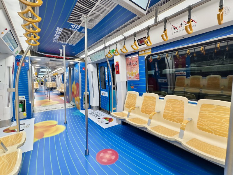 18號線“世園號”主題列車提煉了世園會“芙蓉花開”“國寶熊貓”兩種主視覺元素進行定制化設計。以“芙蓉花開”展現(xiàn)花簇蓉城。車門主要呈現(xiàn)芙蓉花開的意境,一花一色、次第綻放,在黑白水墨之間讓人眼前一亮,展現(xiàn)了世園會花團錦簇、絢麗多彩的自然景象。以“國寶熊貓”詮釋特色成都。車身則突出了“熊貓”元素,使用水墨畫的筆觸勾勒出憨態(tài)可掬、生動可愛的國寶形象,代表著圓融柔和、開放友好的成都姿態(tài)。畫面中的熊貓正在向前方招手,不遠處各色芙蓉花影搖曳、漸變交疊,呈現(xiàn)熊貓嬉戲花叢的生動畫面,勾勒出人與自然和諧共生的美好畫卷。以“曲水流觴”彰顯文化魅力。全車線條流暢、舒展,綿延的曲線讓整體車廂呈現(xiàn)出曲水流觴的傳統(tǒng)詩意和動靜結(jié)合的文化意境,寓意著世園會在成都延展、融合,以生動之姿歡迎全球游客共赴世園之約,共享生態(tài)之美。