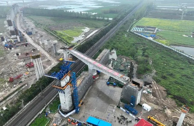 4月2日,滬渝蓉高鐵武宜段漢口至漢川東西南下行聯絡線跨漢丹鐵路特大橋轉體完成。新華社記者 程敏 攝