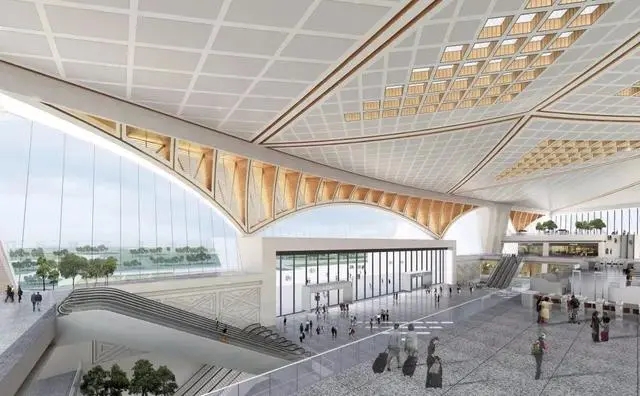 站房以“秦山渭水,絲路長安”為設計理念,通過高低起伏、錯落有致的菱形屋面形態,塑造出“八百里秦川”的恢弘氣勢。正立面運用靈動的弧線造型,勾勒出絲綢飄動的飛舞之勢,寓意西安東站將成為新時代“一帶一路”上的新地標。
