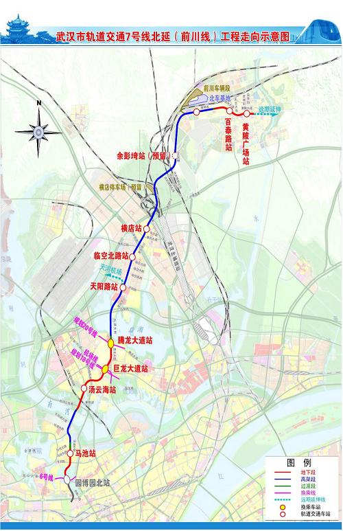 武漢地鐵7號線北延(前川線)二期工程自橫店站(不含)至黃陂廣場,全長15.4公里,共設4站(包括1座預留車站)。前川線二期建成后將與前川線一期貫通運營,給前川、橫店、盤龍城片區居民的出行帶來極大便利。按照計劃,前川線二期將于年內開通。