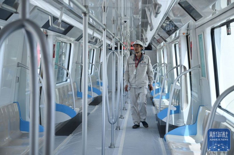 4月24日,工作人員在合肥軌道交通8號線一期首列電客車車廂內(nèi)查看。