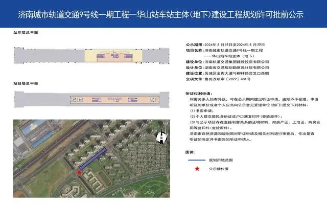 4月25日,濟南市自然資源和規劃局發布了關于濟南軌道交通9號線一期工程華山站車站主體(地下)建設工程規劃許可的批前公示。