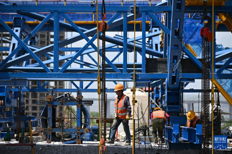 4月25日,工人在位于陜西省銅川市的西延高鐵沮河特大橋施工。