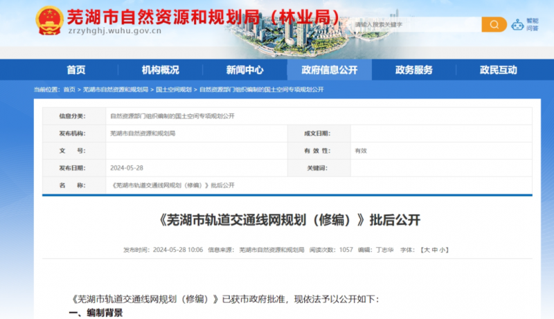 5月28日,蕪湖市自然資源和規劃局網站公開了《蕪湖市軌道交通線網規劃(修編)》(以下簡稱《規劃》)。此次規劃年限與國土空間總體規劃的規劃年限一致,為2035年,遠景展望至2050年。