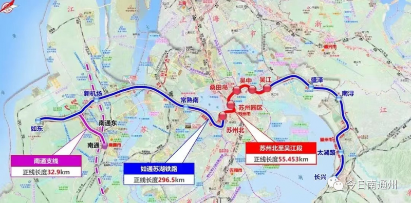 通蘇嘉甬鐵路如東延伸段是《長江三角洲地區交通運輸更高質量一體化發展規劃》和《長江三角洲地區多層次軌道交通規劃》重點建設項目,擬自南通站引出,經通州區至如東縣,全線設南通、通州北和如東東三個車站,正線全長約54km。