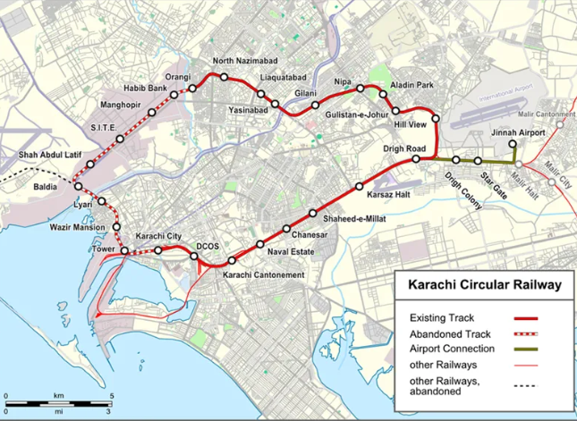 卡拉奇環(huán)線鐵路KCR全長(zhǎng)約43公里,軌距為1676mm,設(shè)有24個(gè)車(chē)站,位于巴基斯坦信德省卡拉奇市,在卡拉奇都市區(qū)提供通勤服務(wù)。