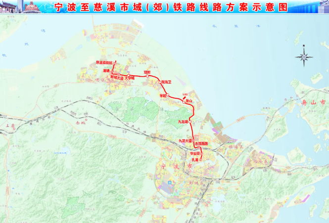 市域鐵路慈溪線起于江北孔浦站,與2號線孔浦站換乘,經江北城區、鎮海城區、九龍湖鎮、龍山、掌起、觀海衛、慈溪城區,終至慈溪高鐵站。線路全長約64公里,共設13座車站,3座隧道。
