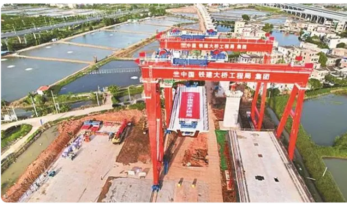 16時許,隨著一榀長32.6米、寬12.2米、重達710噸的預制雙線箱梁平穩地架設在橫欄站橋段橋墩上,標志著深江高鐵建設關鍵節點——首榀箱梁架設成功,項目進入全線架梁施工階段。