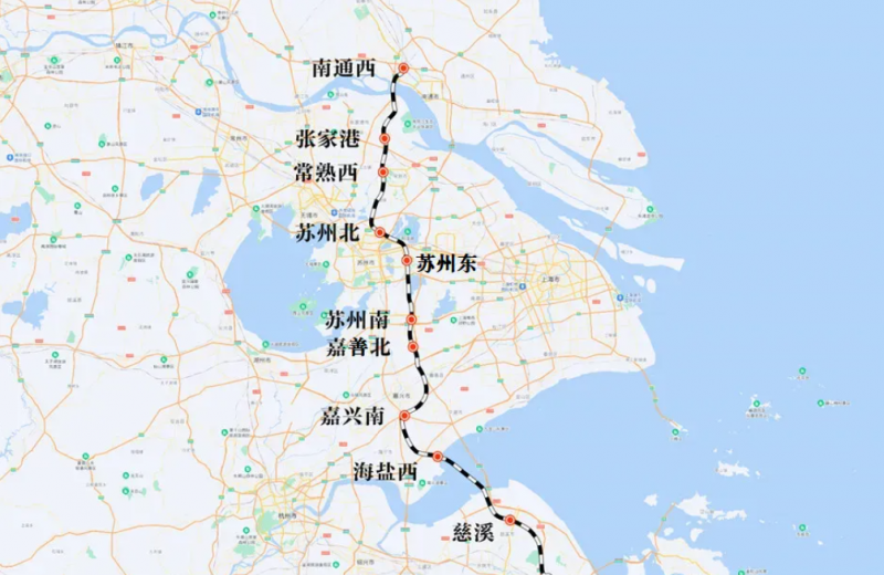 通蘇嘉甬鐵路位于江蘇省和浙江省境內,為南北向高鐵,線路北起南通市南通西站,與鹽通鐵路正線貫通,經過蘇州市、嘉興市后跨過杭州灣進入寧波市,全線設南通西、張家港、常熟西、蘇州北、蘇州南、嘉善北、嘉興南、海鹽、慈溪、莊橋等10座車站,設計時速為350km/h。