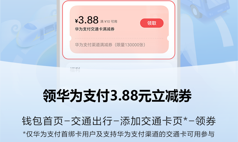 即日起至8月29日期間,暑期期間在華為錢包交通卡開卡/充值界面華為支付新綁卡用戶可免費領取3.88優惠券一張,活動參與方法特別簡單,直接進入華為錢包交通卡開卡/充值頁,即可看到優惠券!領取后,一鍵開通華為支付后即可使用!優惠券數量有限,先到先得。大大的羊毛,快來參與吧!