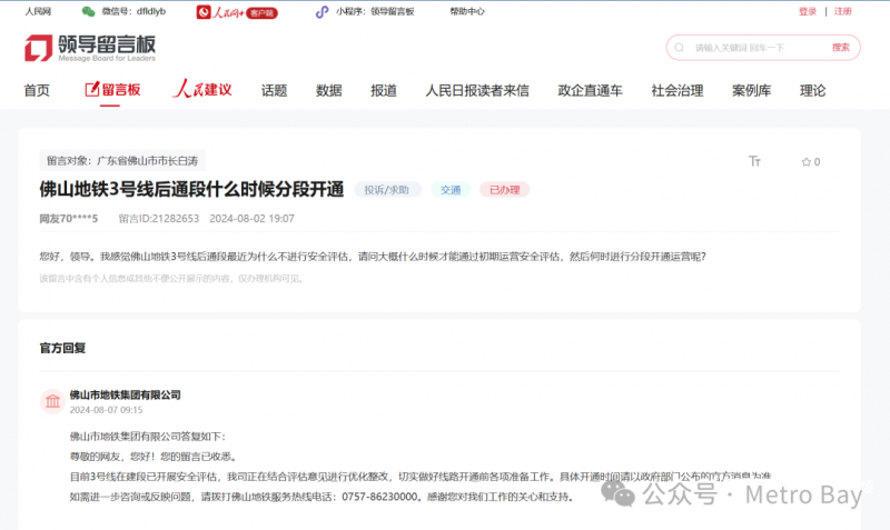 8月7日,記者從人民網留言板獲悉,佛山市地鐵集團有限公司公開答復市民稱,目前3號線在建段已開展安全評估,我司正在結合評估意見進行優化整改。這一消息引發議論,有市民懷疑,佛山地鐵3號線后通段未通過安全評估。